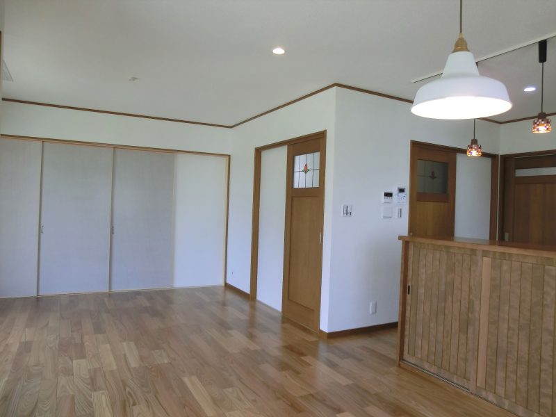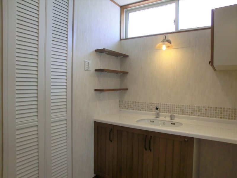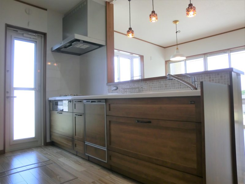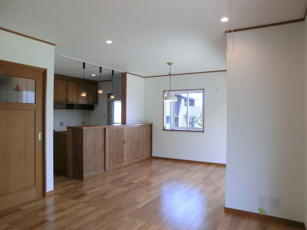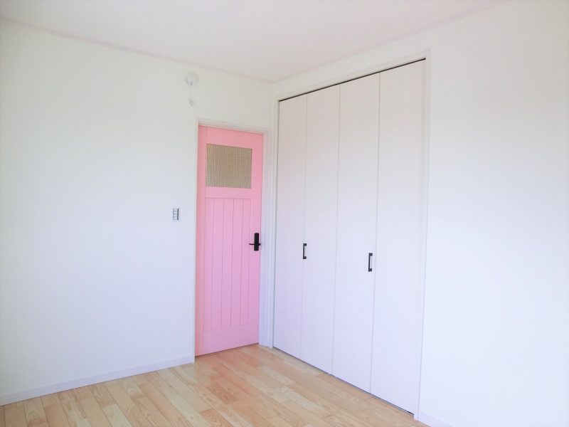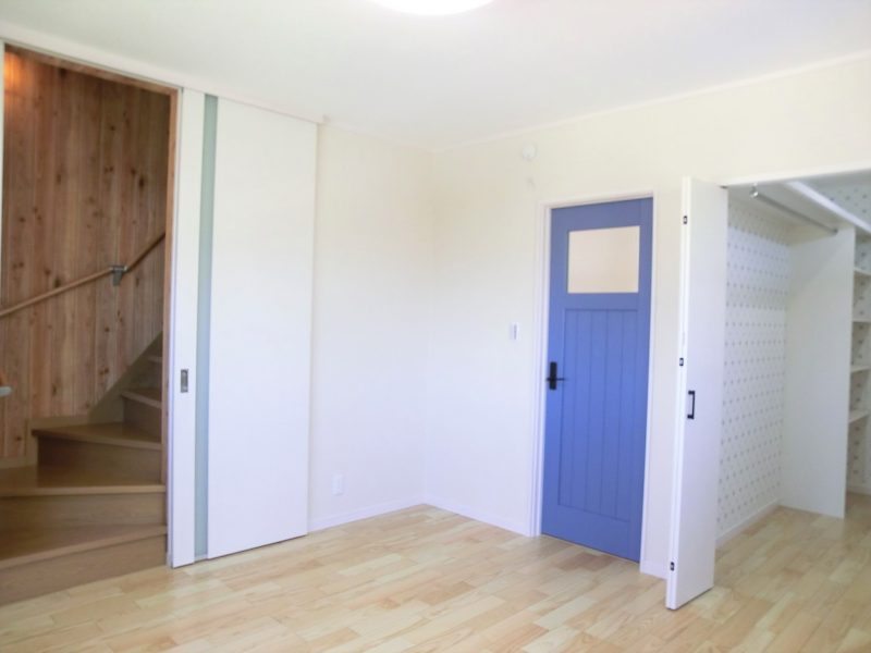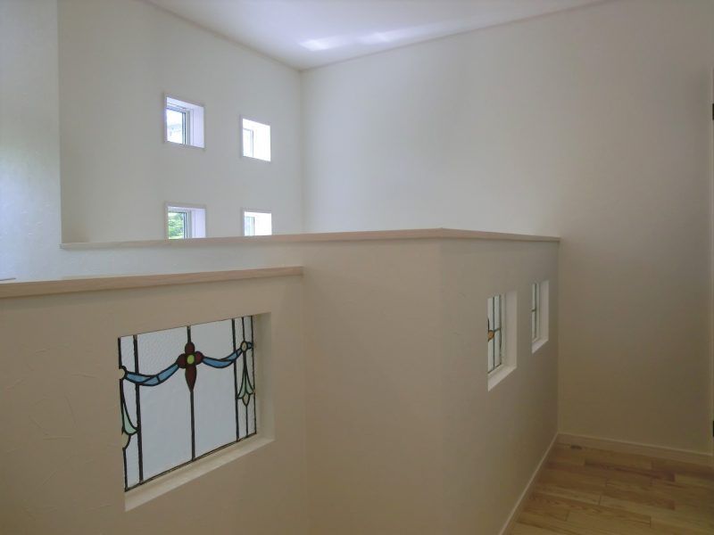 カントリー風の可愛い家 無垢材のキッチンを取り入れ、 木のぬくもりを感じる内装に、 ステンドガラスや特徴的な照明を ポイントにあしらった可愛いお家です。 オーダーペイントドアがより一層、 カントリーの可愛らしさを演出しています。 板張りの小屋裏収納はコテージのようで、 雰囲気を変えたつくりになっています。