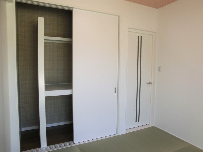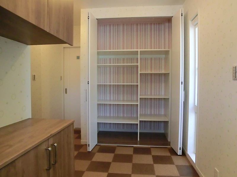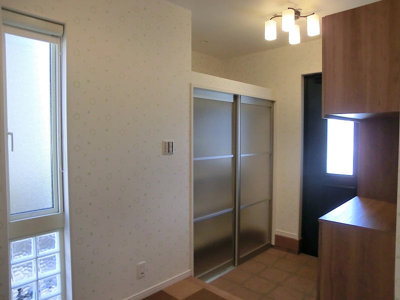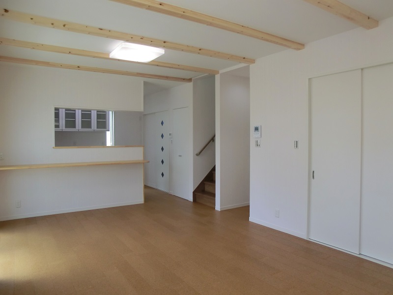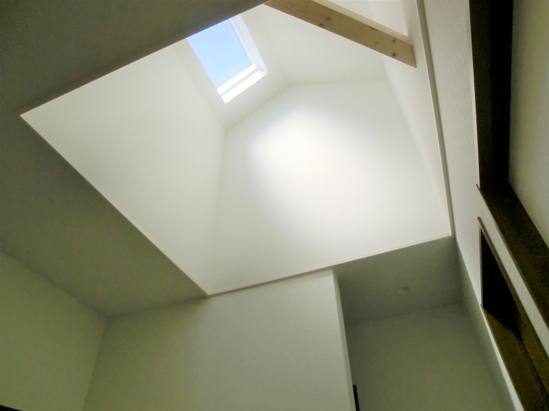 クロス使いが特徴的な家 クロス使いが楽しいお家です。 扉を開くたび笑顔になるような 多種多様のクロスを使用しています。 玄関ホールとLDKはコルク床仕上げです。 夏はサラサラ、冬はヒヤッとしません。 足触りが柔らかい健康的な建材です。 階段上には天窓を設け、 明るく開放的な二階ホールとなりました。
