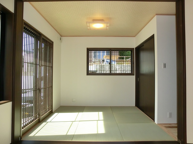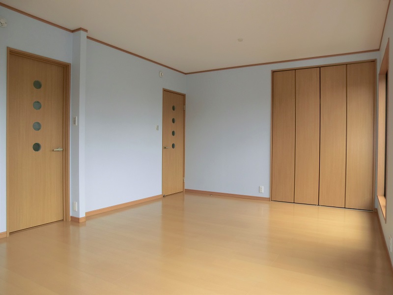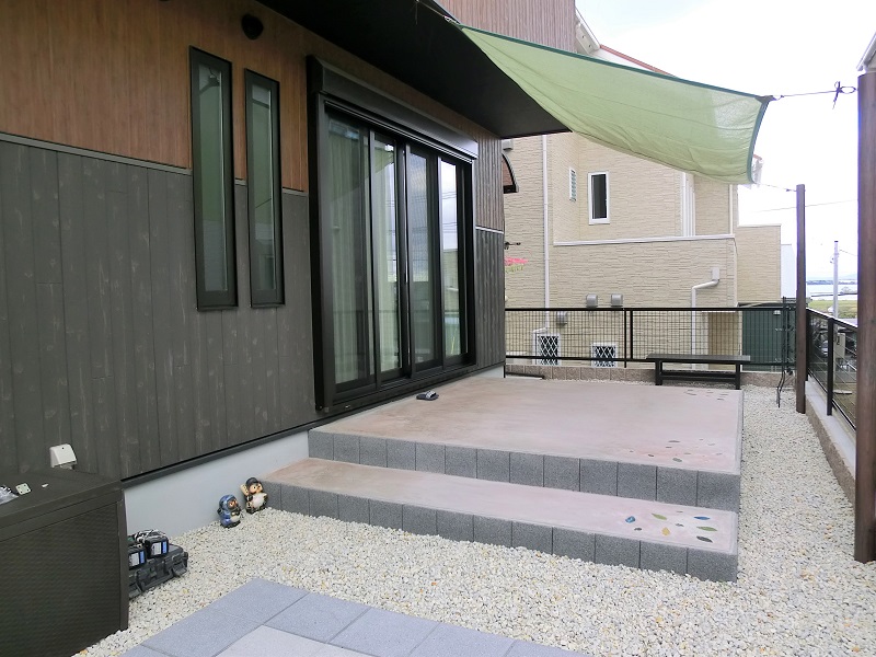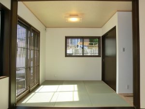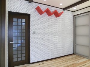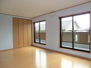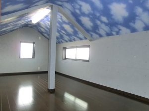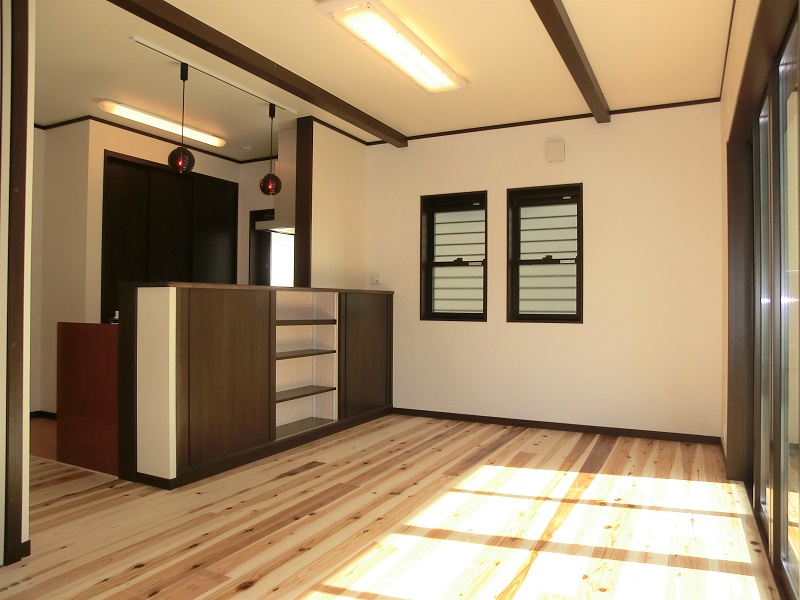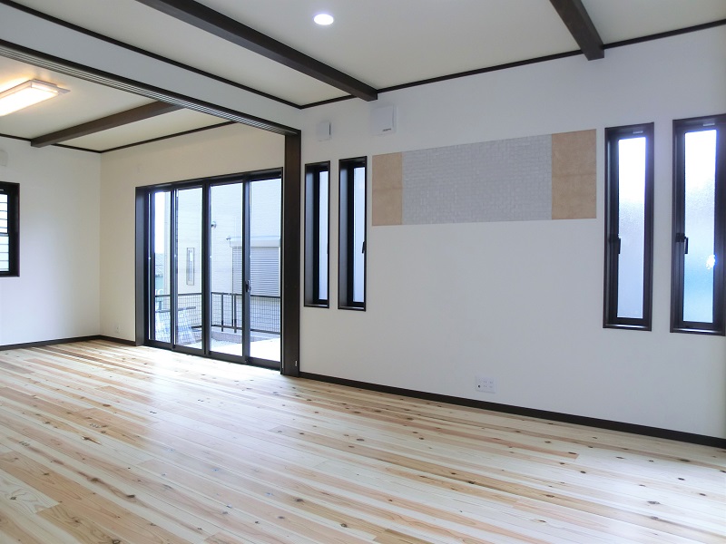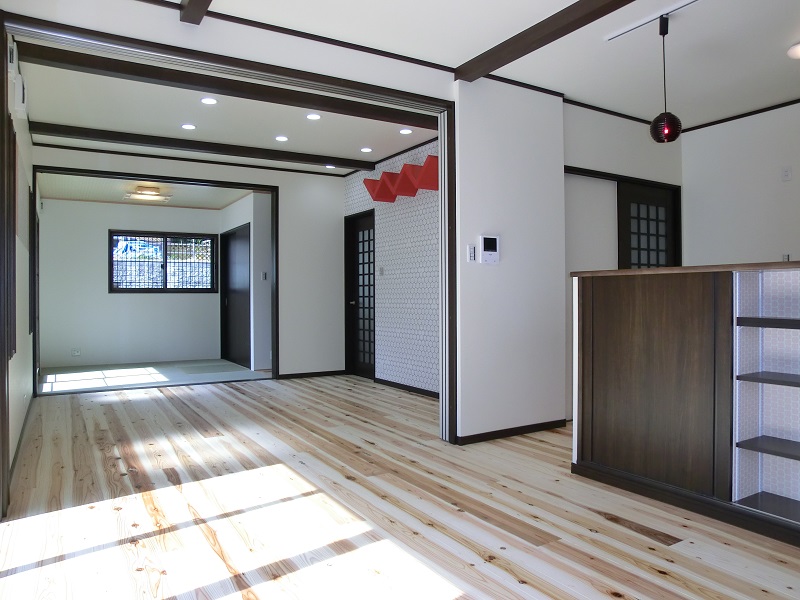 三部屋が直線でつながる家 一階にひろがる大空間は、 和室・リビング・ダイニングキッチンが 直線的につながっているものです。 それぞれ間仕切ることも可能で、 様々なシチュエーションに対応できます。 子供部屋は将来分離型で広めに設計、 小屋裏は趣味の部屋として明るくし、 庭にカラーコンクリートの土間を造るなど 遊び心あふれる家となっています。