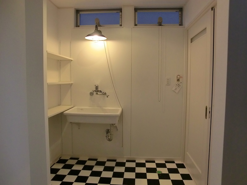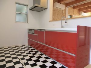 白黒のクッションフロアーに赤のキッチン、