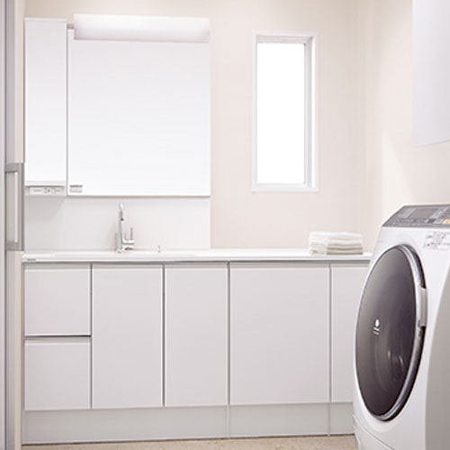つなぎ目などの凹凸がなく、飛び散った水滴をさっと拭き取れます。しかも洗面容量は16Lの大容量です。